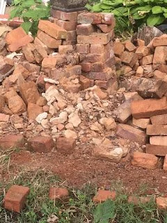 Rubble has a smell; dusty, dank, muddy. The feel is crumbly, soft and hard. It is unstable and unwieldily. These chimney bricks are manageable, 2" x 4" yet easily can cause the back to ache. Cinderblock and rebar housing structures are far more dangerous. Both can be ankle twisting, back breaking, life threatening. The reclamation of the rubble is time consuming and painstaking, finding reusable forms, chipping off the mortar. The destruction of a chimney requires care and strategy, so as not to damage the house. The destruction of a cinderblock structure is often fueled by greed or hate or both. The destruction is rapid, near instant. The dust takes a while to settle, is suffocating and slow.